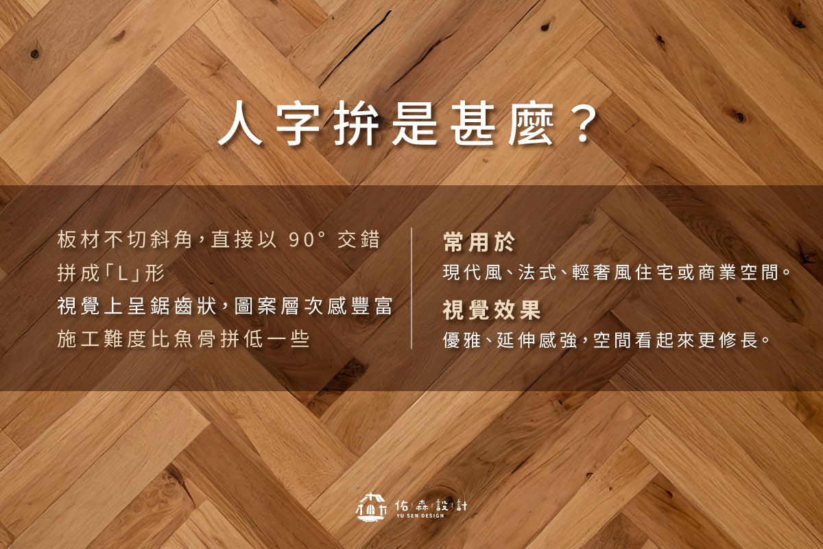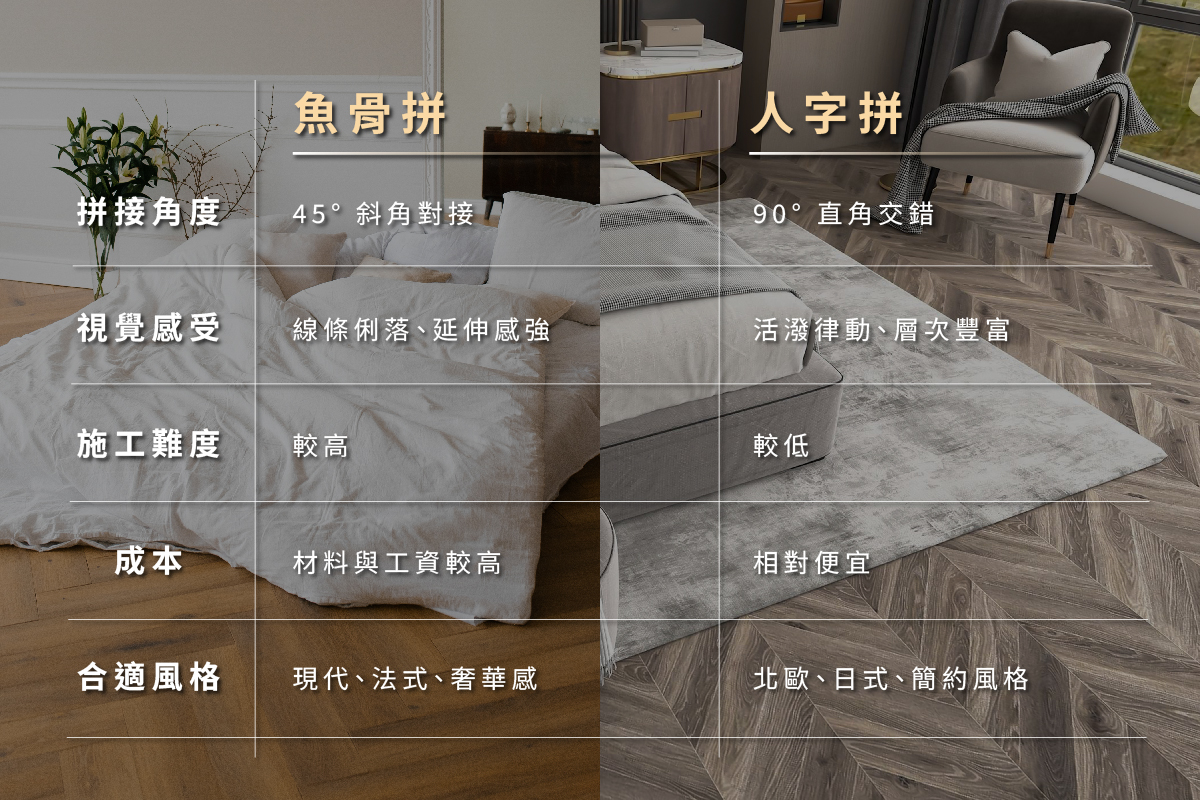 魚骨拼與人字拼都是木地板、磁磚或石材常見的鋪排方式,兩者雖然外觀看起來相似,但鋪法、視覺感與施工難度都不太一樣