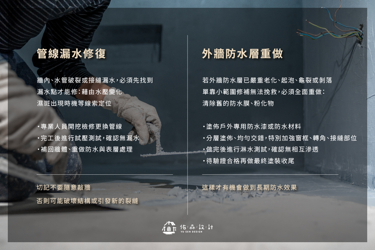 根據滲水範圍、原因與損壞程度不同,修復方法也不同。以下為常見類型與步驟: