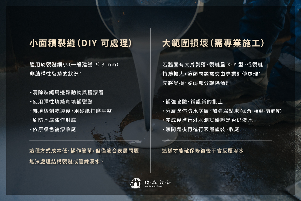 小裂縫、表面滲水可以自己嘗試處理,但遇到結構裂縫、管線漏水、外牆問題時,一定要找專業技師。錯誤的自行修繕可能引發更大損壞。