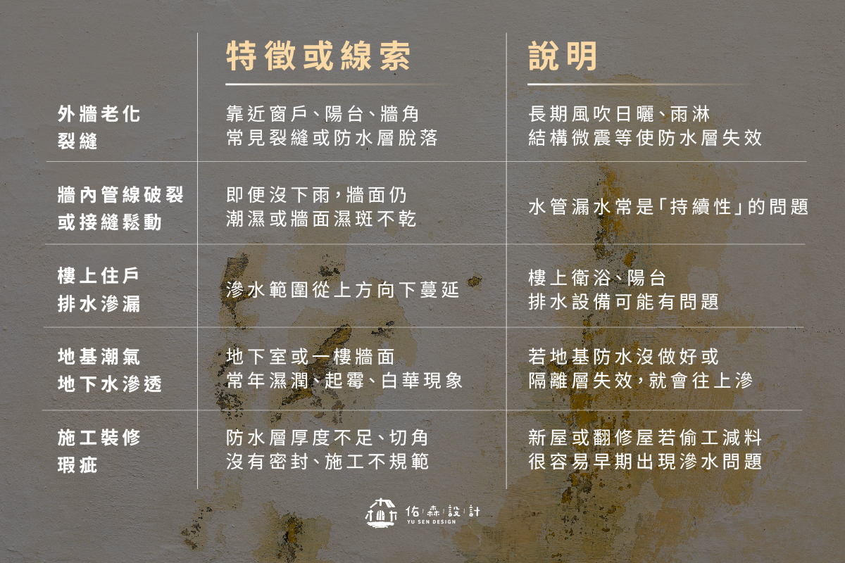 施工、裝修瑕疵 | 防水層厚度不足、切角沒有密封、施工不規範 | 新屋或翻修屋若偷工減料,很容易早期出現滲水問題 |
