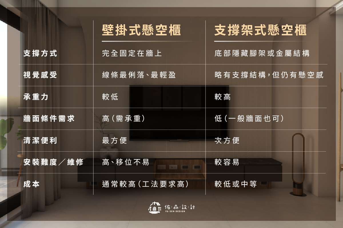 - 雖是懸空設計,但底部會有結構支撐,視覺上不如壁掛式純淨。