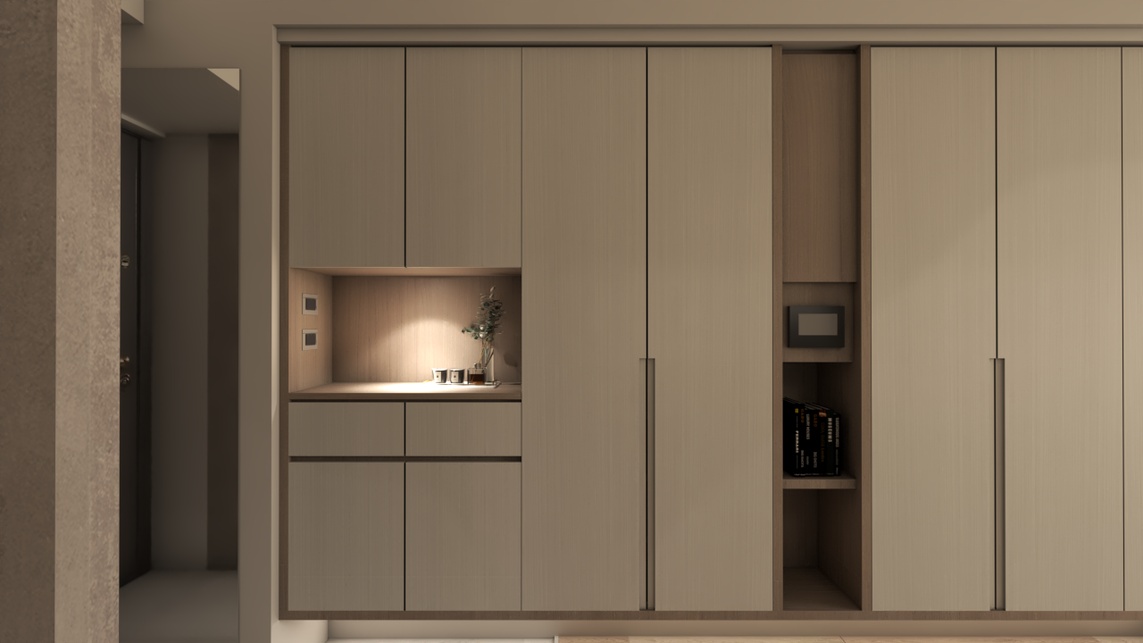 這是最常見且穩妥的做法。將配電箱隱藏在玄關鞋櫃、吊櫃或收納櫃中。